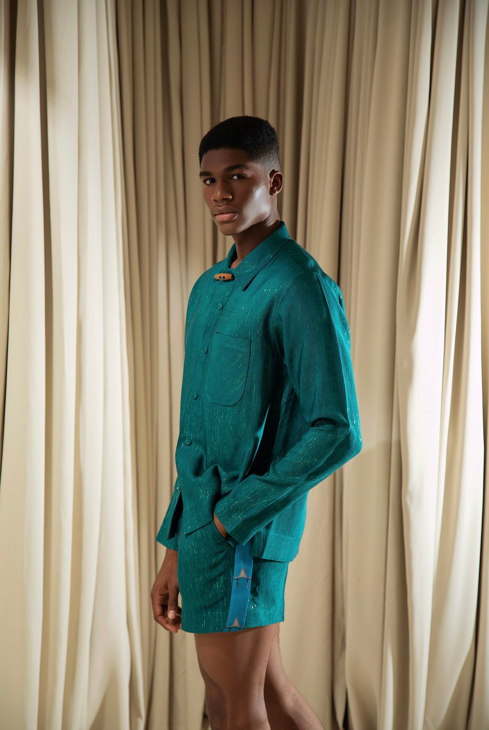 Long sleeved button up akwete shirt with patch pocket, and wooden button detailing